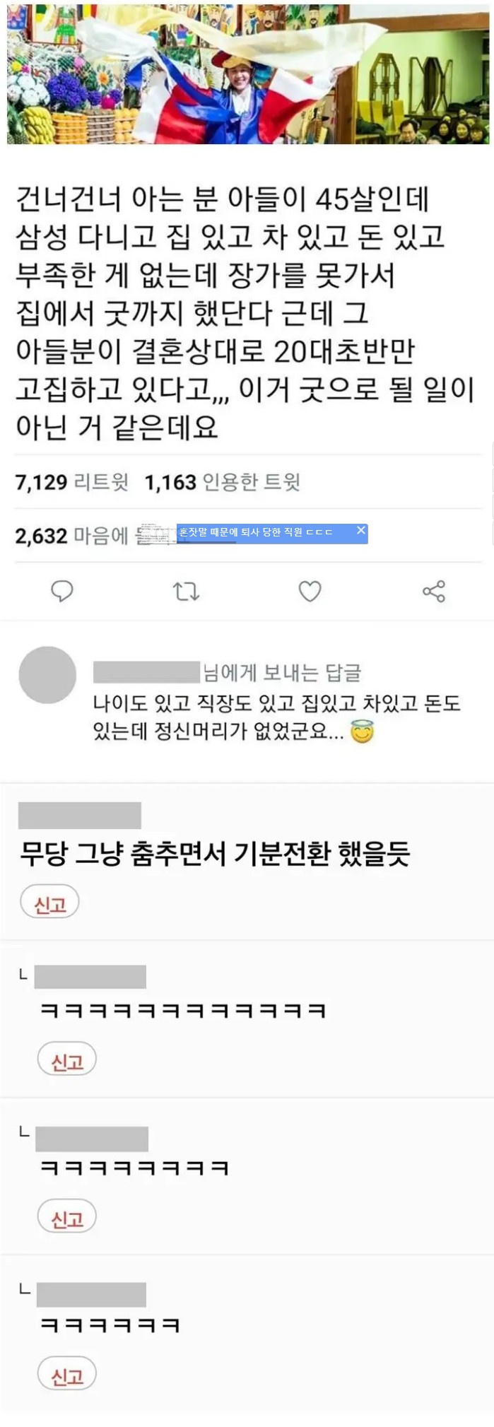 검색 결혼 못해서 굿하는 45세 유우머11 본문 어차피 무당도 안될거 알고 그냥 돈이나 벌자는 생각으로 출장 갔다 왓네 ~ 공유하기 게시글 관리 유우머 '오늘의유우머' 관련 글 팬티를 매일 갈아입지 않는 남편.jpg 2024.04.09 100kg 고도비만 여성 먹방 유튜버에게 팩폭한 서장훈 2024.04.09 이론상 8대까지 주차 가능하다고 예시까지 보여줌 2024.04.06 옆집 자취녀한테 쪽지받은 사람.jpg 2024.04.06